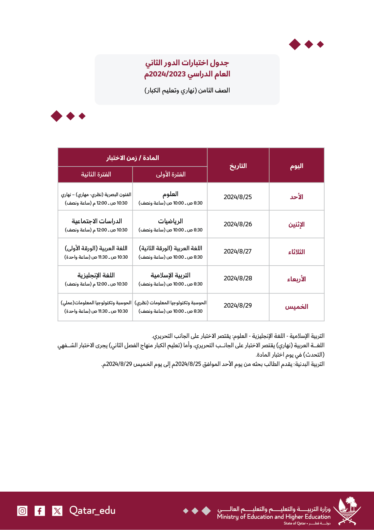 جدول اختبارات الدور الثاني المستوى الثامن لجميع المواد للعام الدراسي 2023-2024