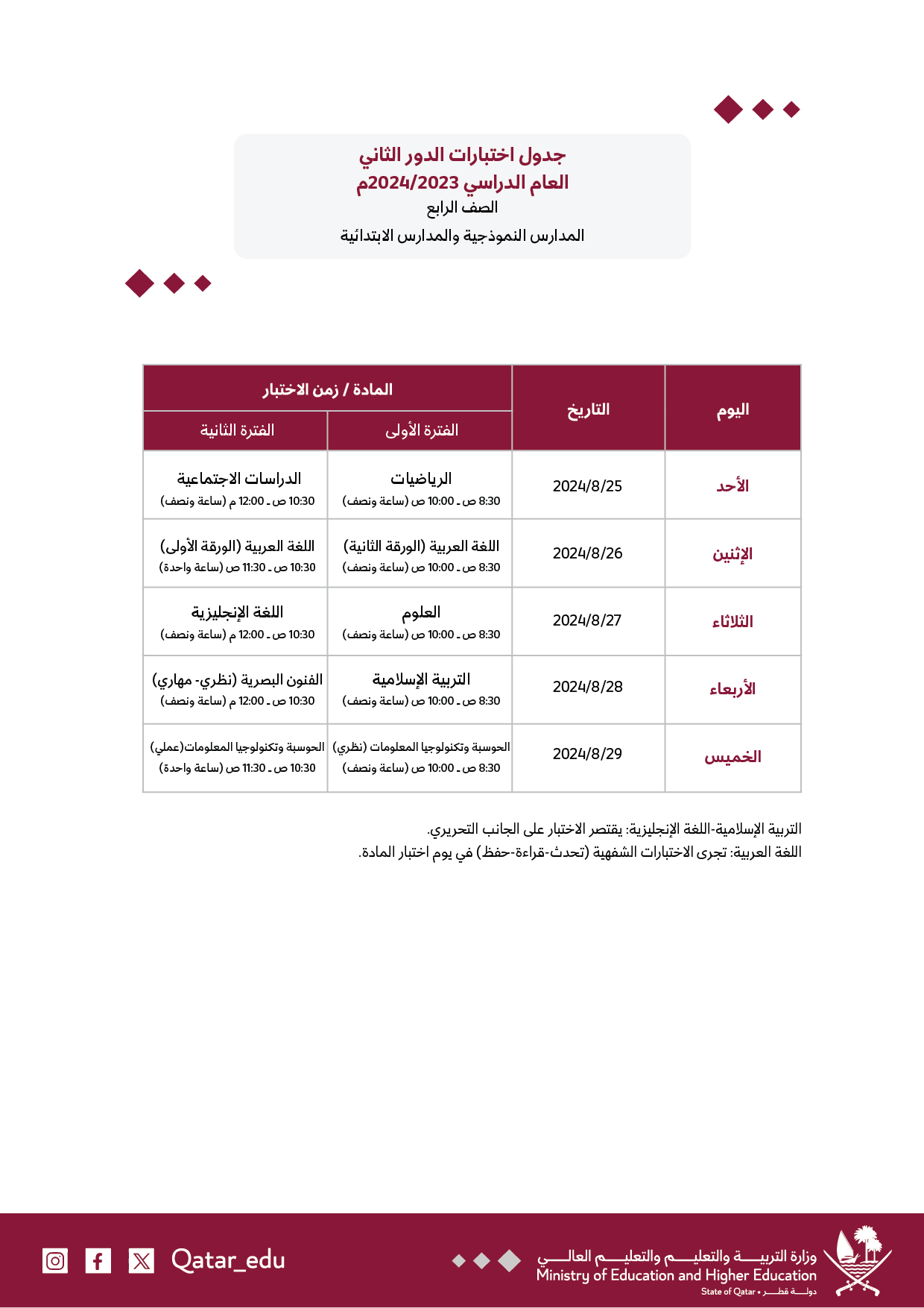 جدول اختبارات الدور الثاني المستوى الرابع لجميع المواد للعام الدراسي 2023-2024
