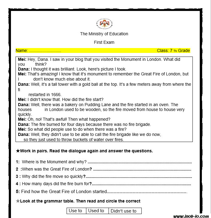 نموذج -1- اختبار الشهر الأول لمادة اللغة الانجليزية team together الصف السابع الفصل الأول