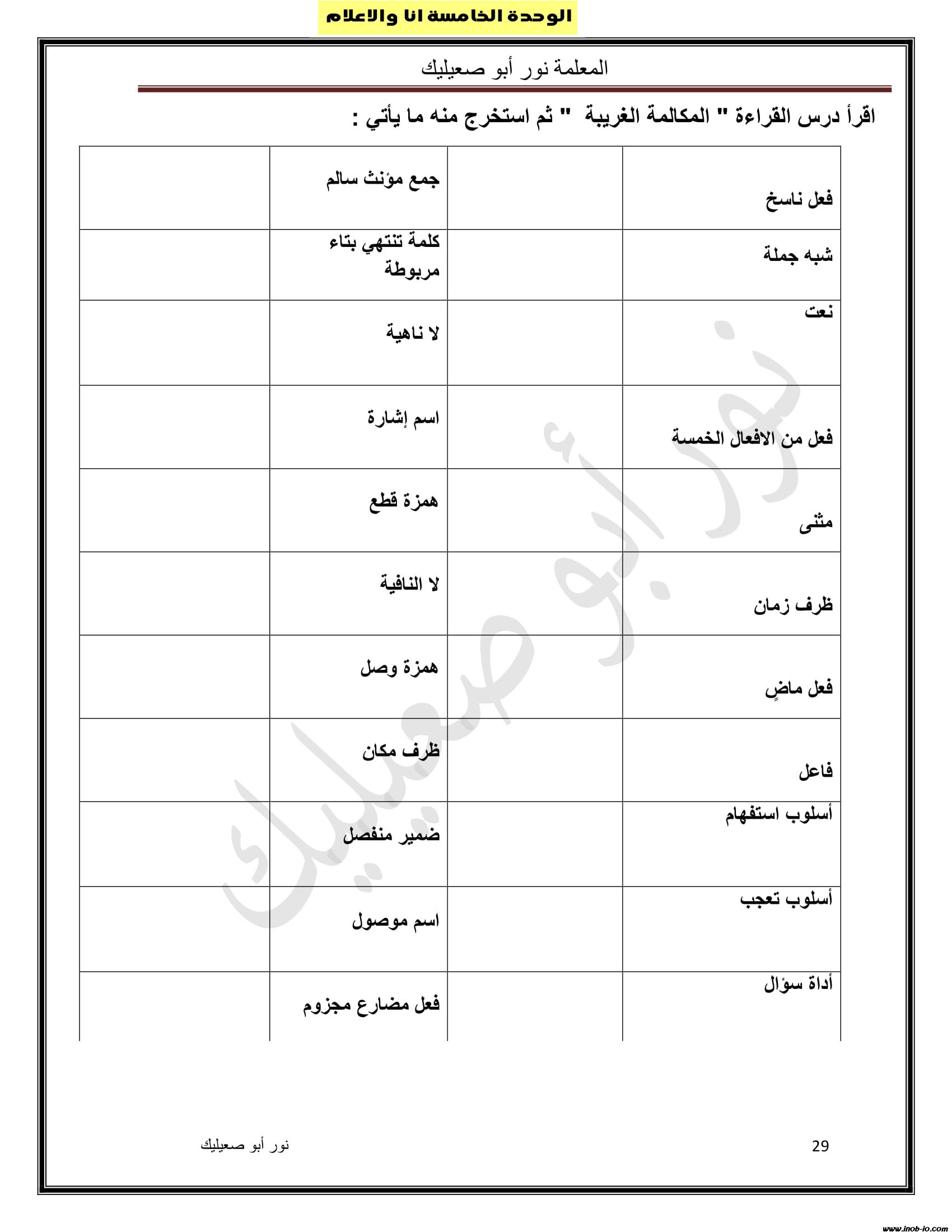أوراق عمل قواعد وحدة أنا والأعلام لمادة العربية لغتي الصف الخامس الفصل الأول