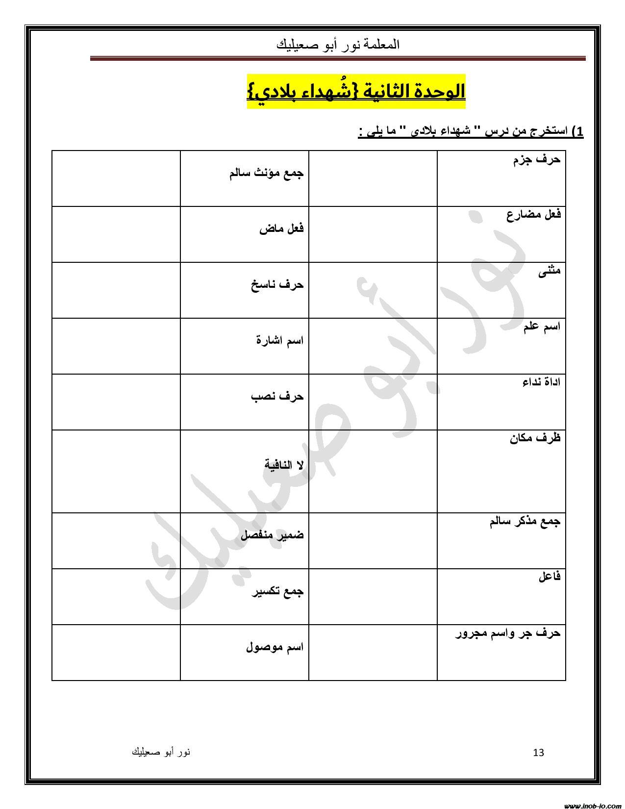 أوراق عمل قواعد وحدة شهداء بلادي لمادة العربية لغتي الصف الخامس الفصل الأول