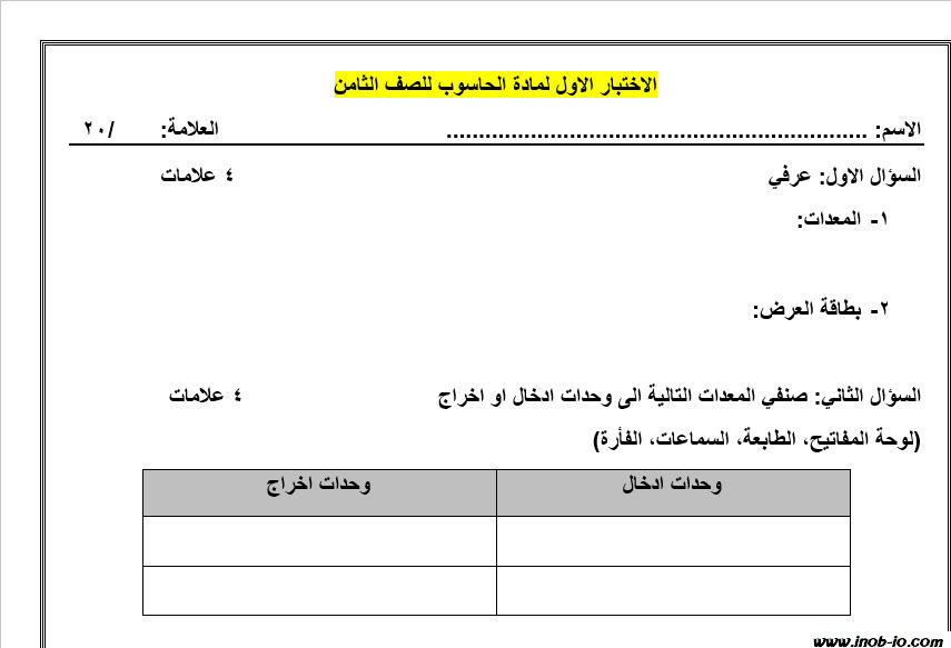 نموذج - 4 - word قابل للتعديل اختبار الشهر الأول لمادة الحاسوب للصف الثامن الفصل الأول