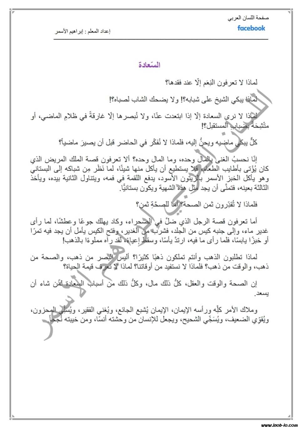 حل درس الاستماع السعادة لمادة اللغة العربية للصف التاسع الفصل الأول