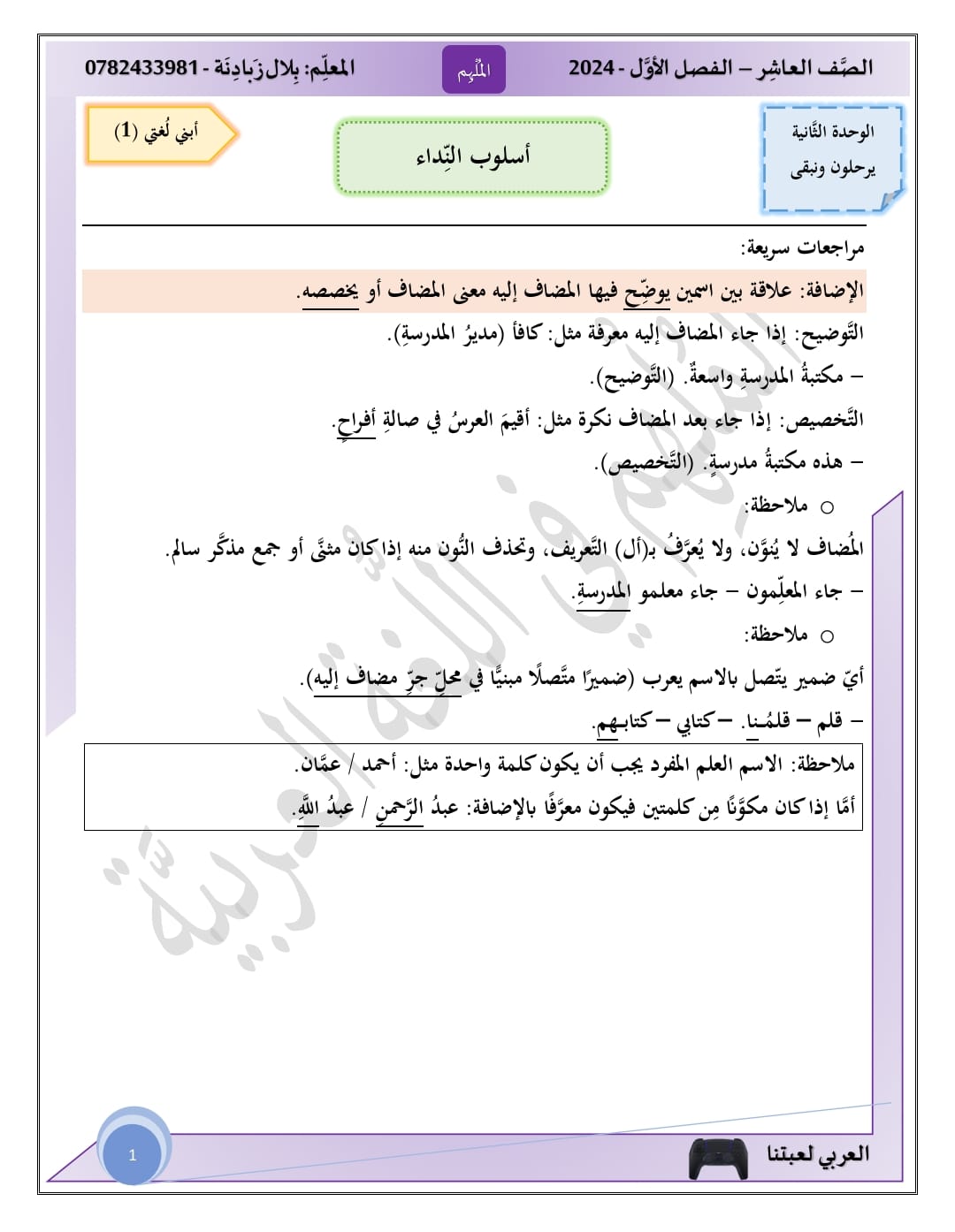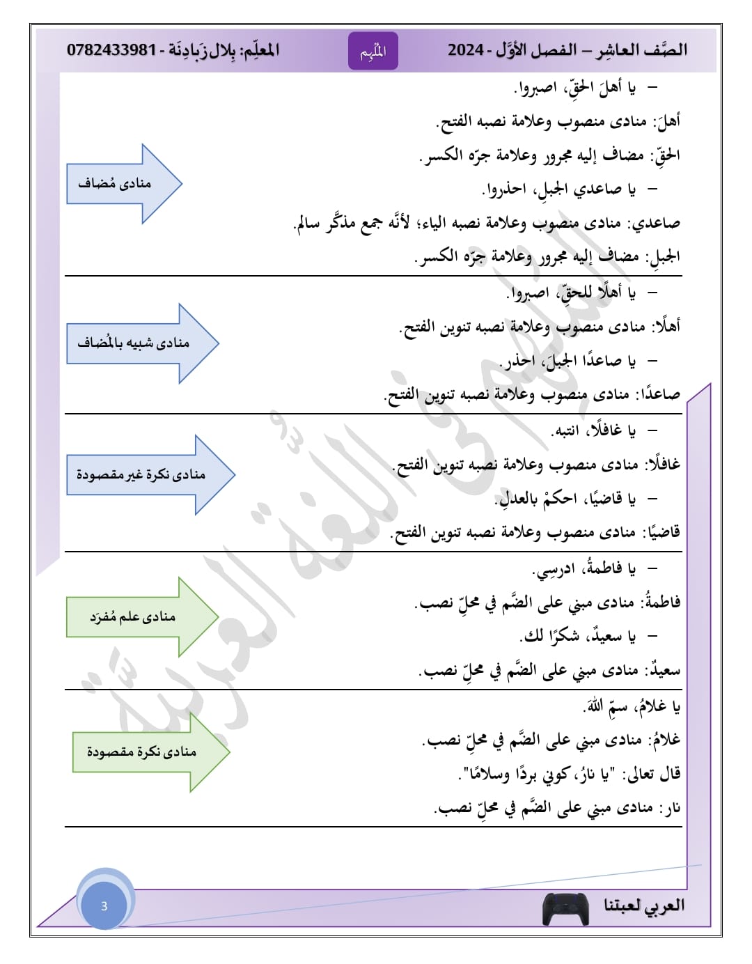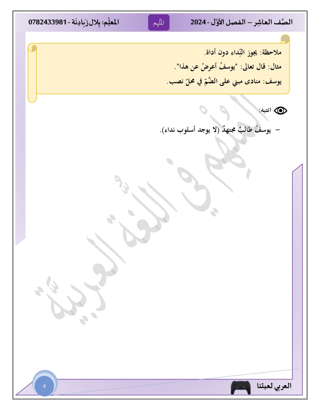 بالصور :. شرح قاعدة أسلوب النّداء لمادة العربية لغتي كتاب الطالب الصف العاشر الفصل الاول