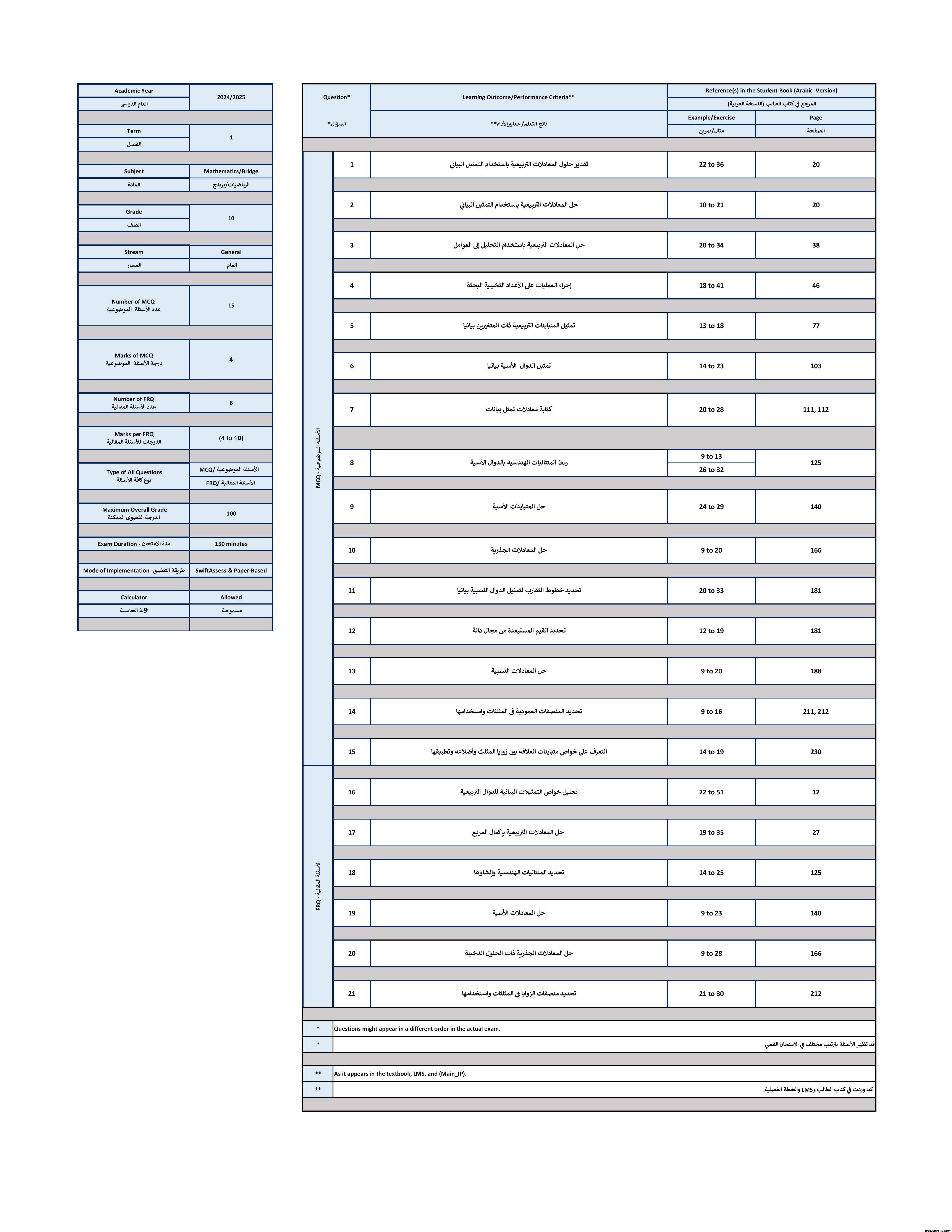 هيكل امتحان مادة الرياضيات المتكاملة الصف العاشر عام بريدج الفصل الأول 2024-2025