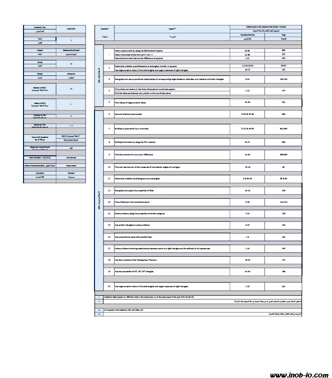 هيكل امتحان مادة الرياضيات المتكاملة الصف العاشر متقدم ريفيل الفصل الأول 2024-2025