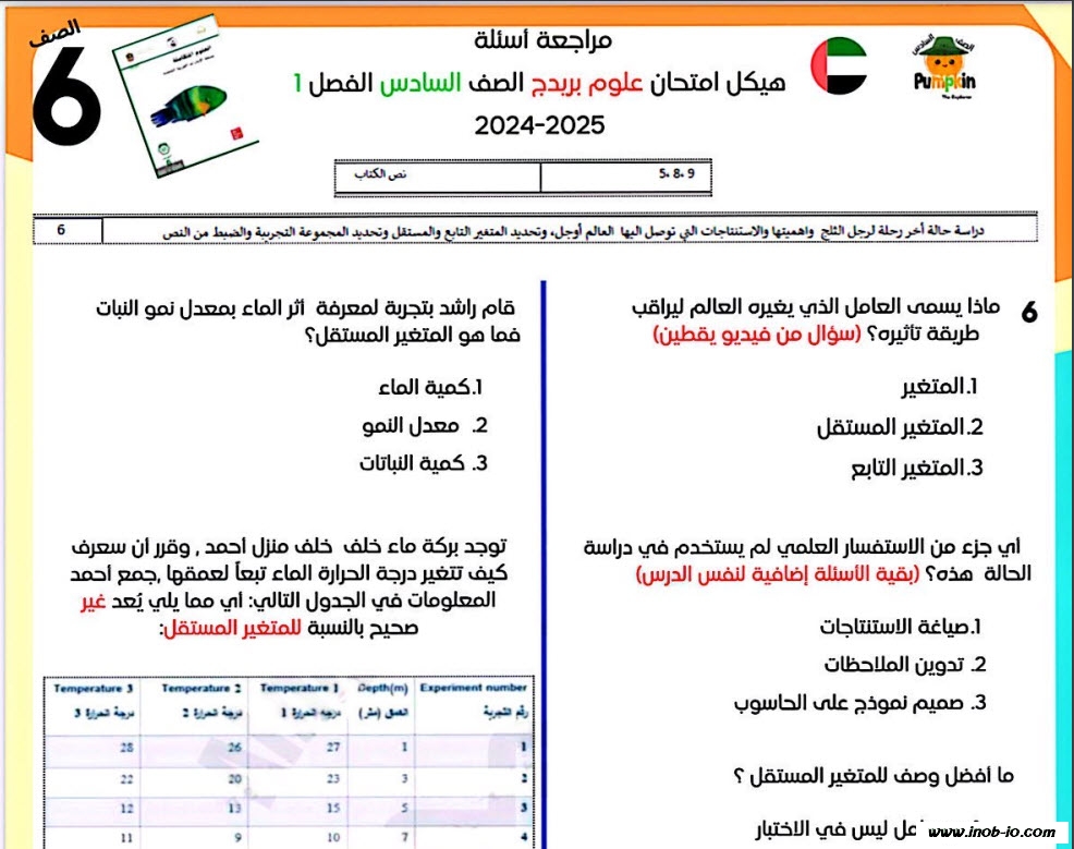 الجزء الالكتروني :. مراجعة أسئلة هيكل امتحان مادة العلوم المتكاملة بريدج الصف السادس الفصل الاول 2024-2025