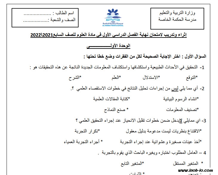 نموذج -16-اختبار تدريبي لمادة العلوم المتكاملة الصف السابع الفصل الأول