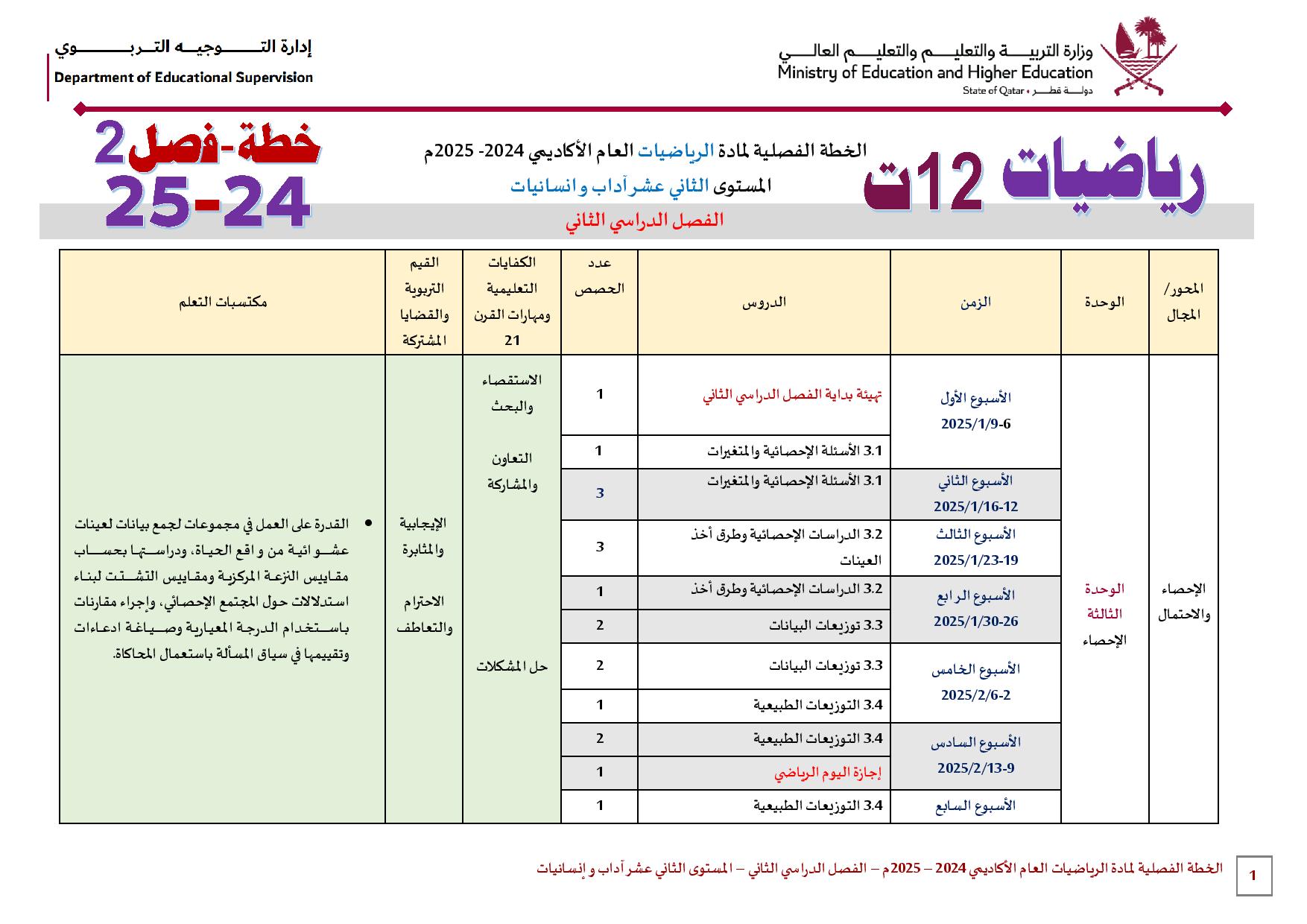 الخطة الفصلية لمادة الرياضيات العام الاكاديمي المستوى الثاني عشر الفصل الثاني 2024-2025