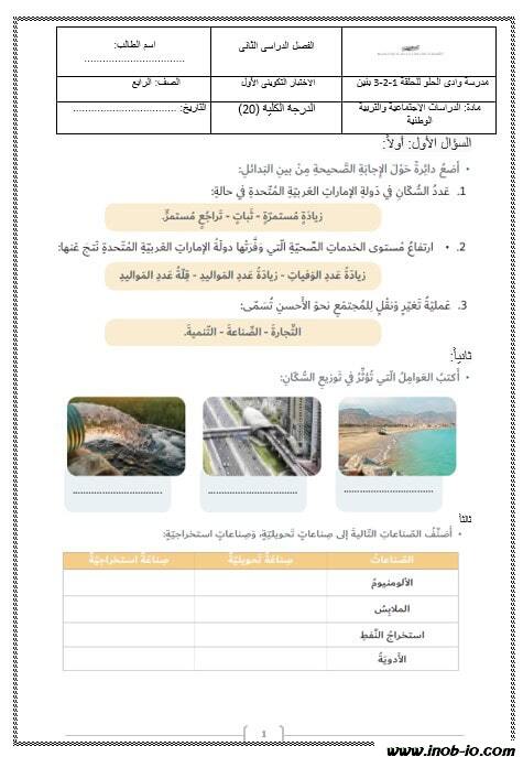 نموذج قابل للتعديل الاختبار التكويني الأول لمادة الدراسات الاجتماعية الصف الرابع الفصل الثاني
