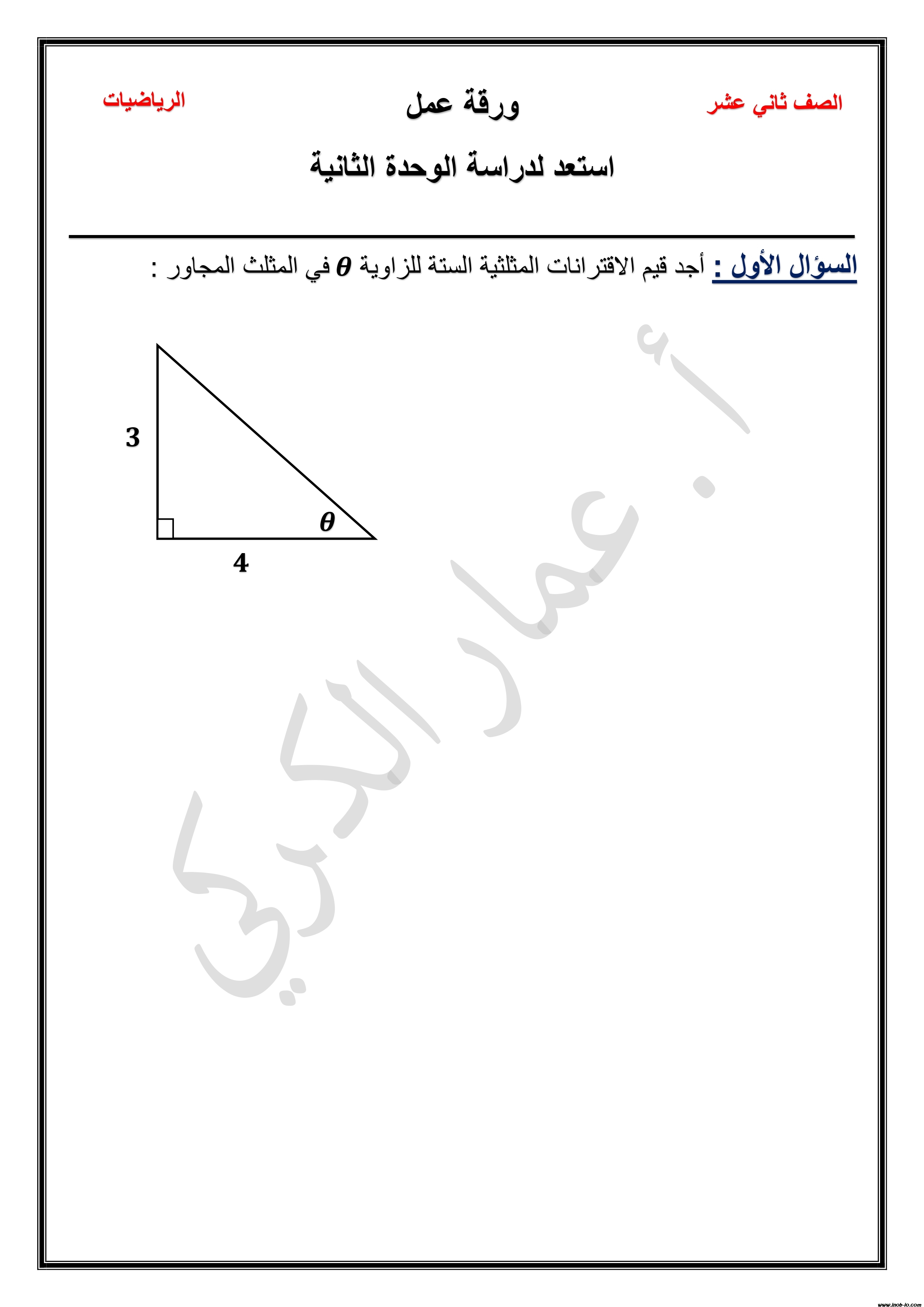 ورقة عمل استعد لدراسة الوحدة الثانية لمادة الرياضيات المتقدم الصف الثاني عشر الفصل الأول