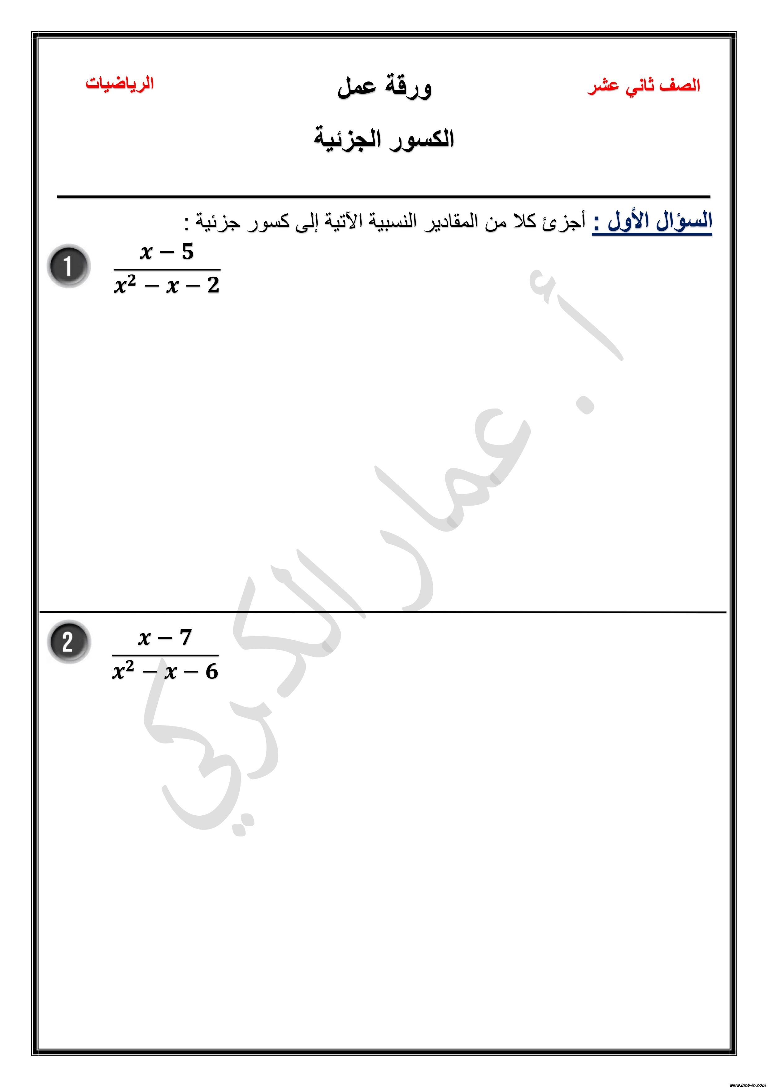 PDF ورقة عمل الدرس الثاني الوحدة الأولى الكسور الجزئية لمادة الرياضيات المتقدم الصف الثاني عشر الفصل الأول