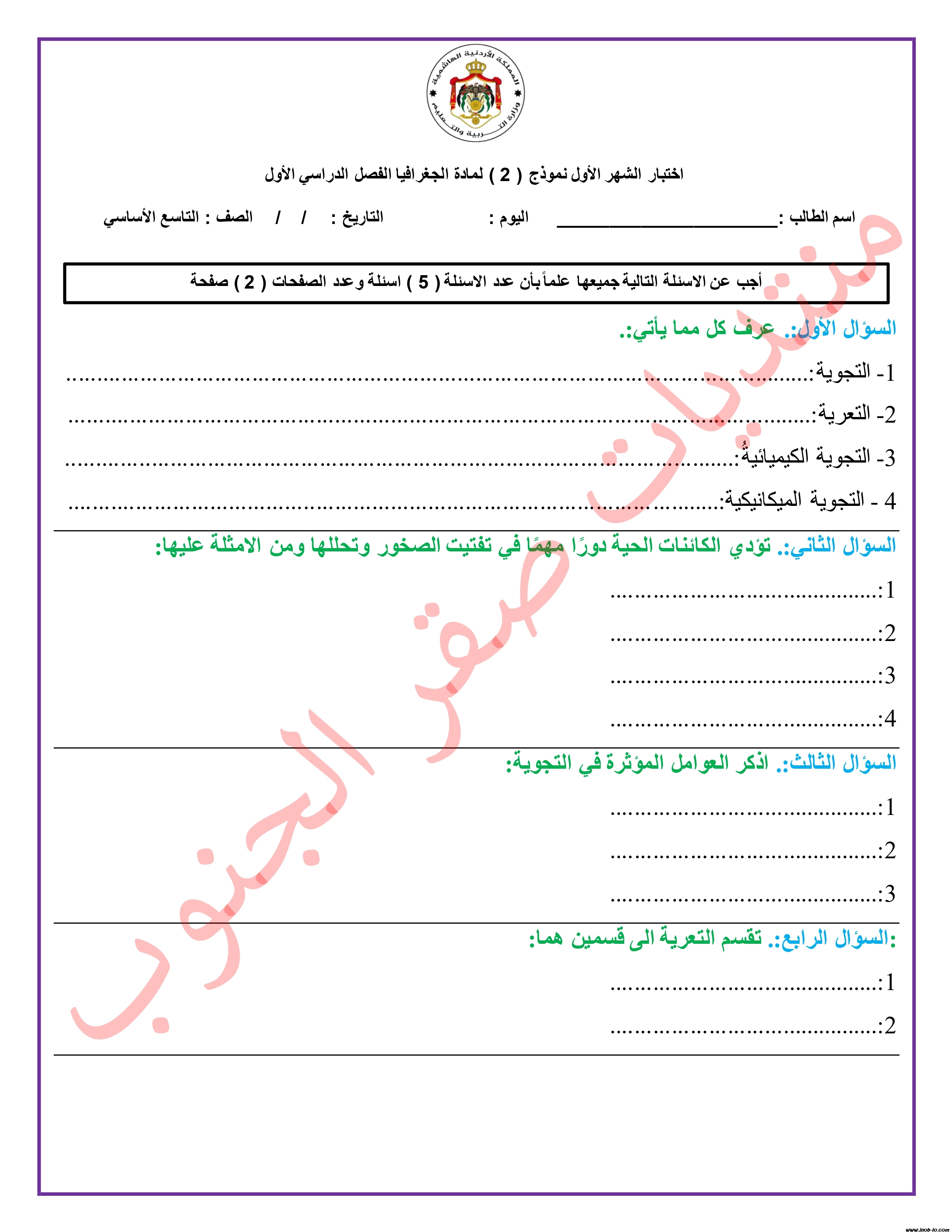 اختبار الشهر الاول لمادة الجغرافيا للصف التاسع الفصل الاول نموذج 2