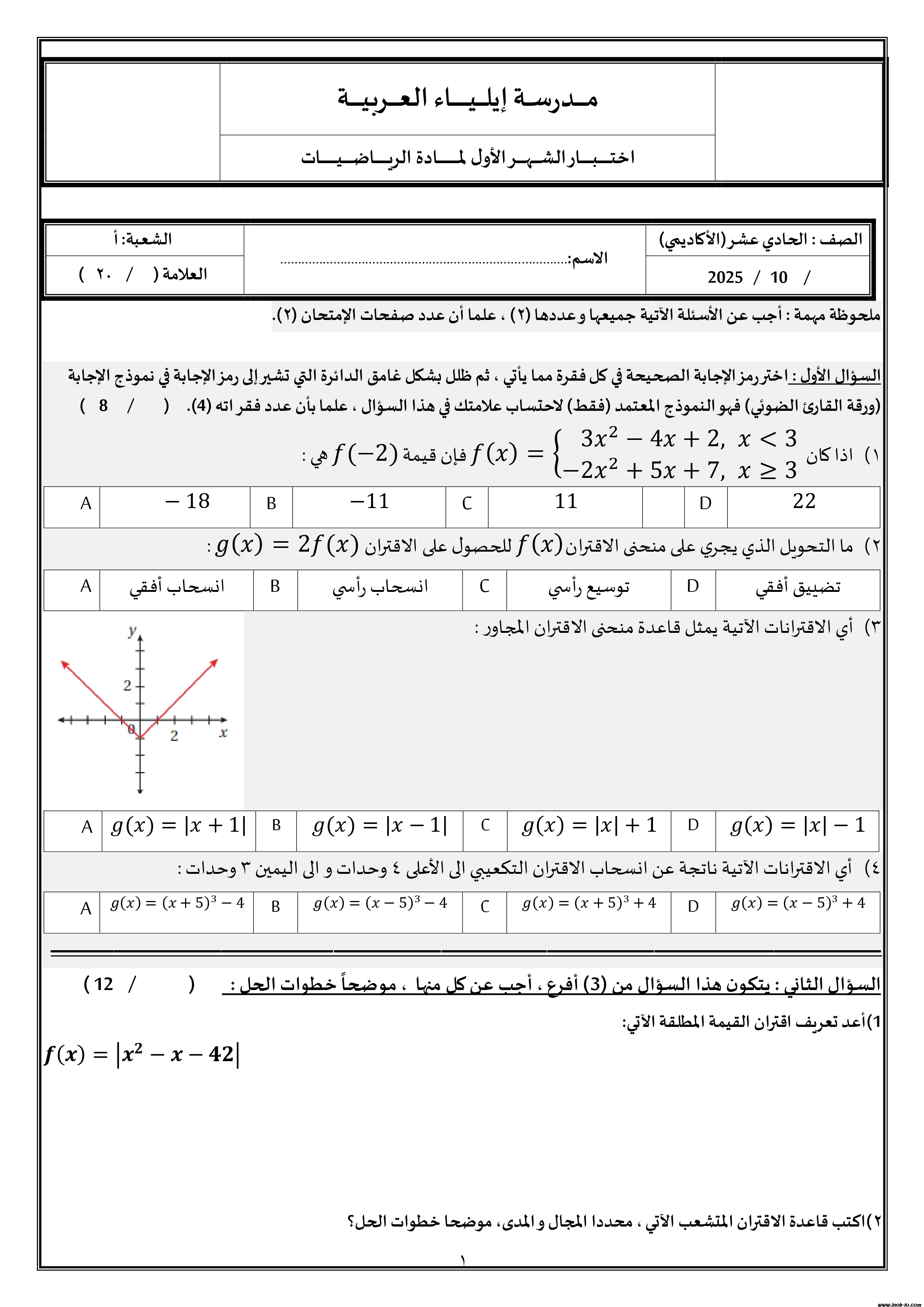 اختبار الشهر الأول لمادة الرياضيات الصف الحادي عشر الفصل الأول نموذج 1