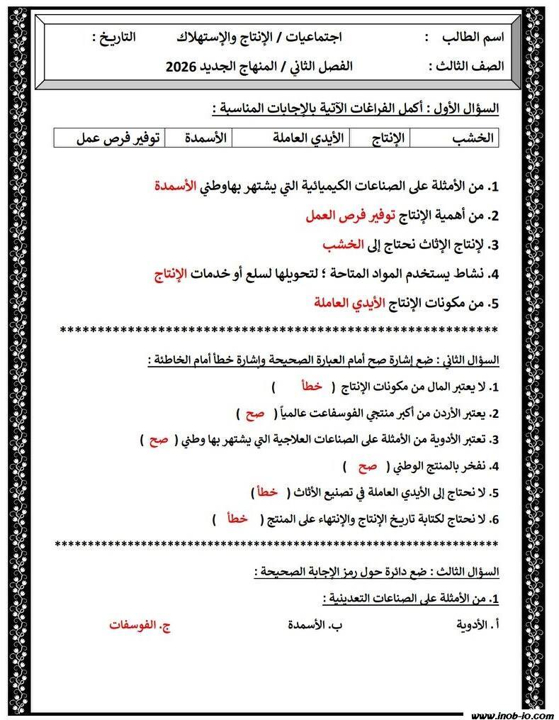 أوراق عمل مع الحلول للدرس الثالث الإنتاج الاستهلاك لمادة الدراسات الاجتماعية الصف الثالث الفصل الثاني