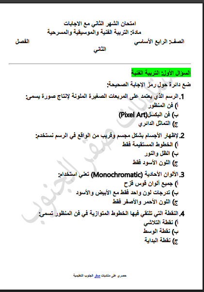 PDF امتحان الشهر الثاني لمادة التربية الفنية والمسرحية الصف الرابع الفصل الثاني نموذج 1