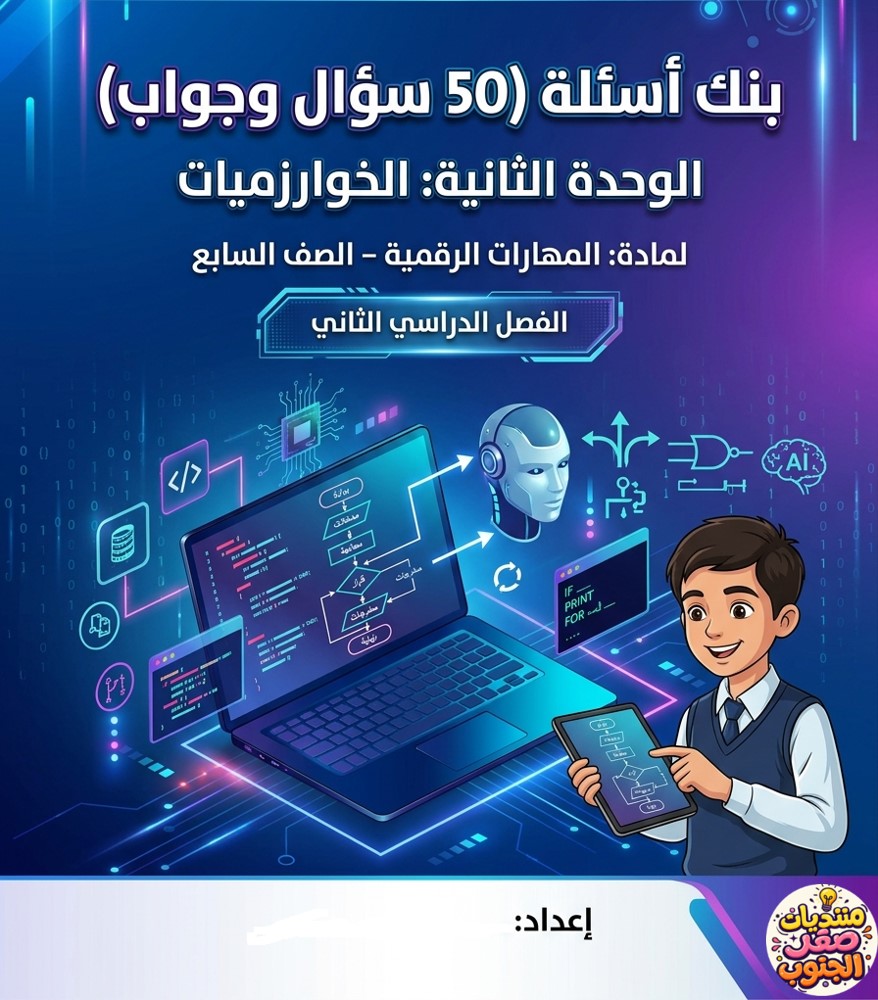 بنك اسئلة 50 سؤال وجواب الوحدة الثانية الخوارزميات لمادة المهارات الرقمية الصف السابع الفصل الثاني
