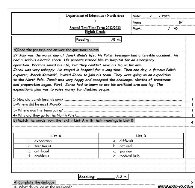 نموذج-3- Word اختبار الشهر الثاني لمبحث اللغة الإنجليزية Action Pack للصف الثامن الفصل الأول