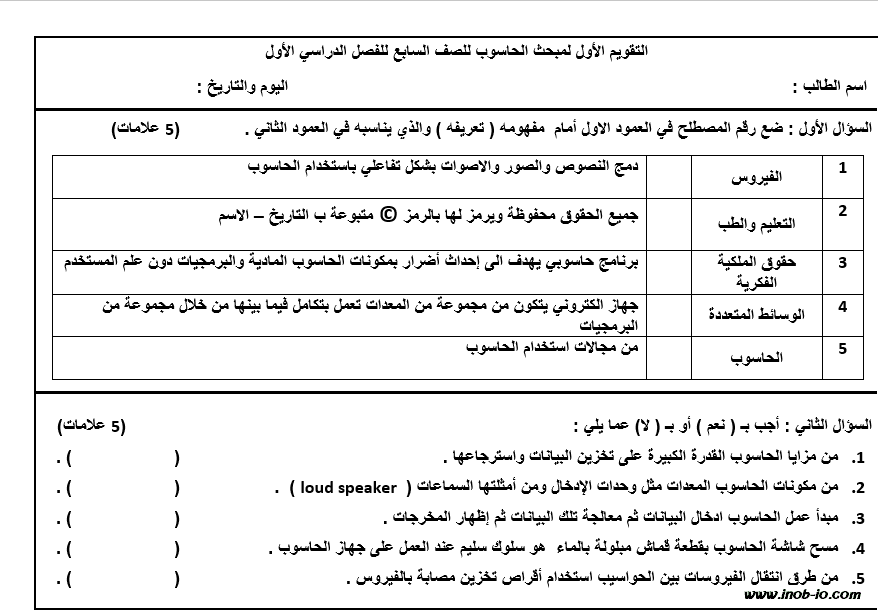 نموذج رقم -1- Word قابل للتعديل اختبار الشهر الأول لمادة الحاسوب للصف السابع الفصل الأول