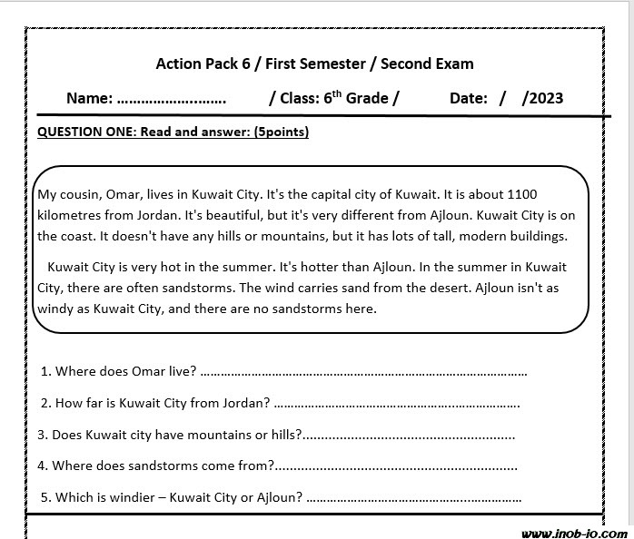 نموذج-1- Word اختبار الشهر الثاني لمبحث اللغة الإنجليزية Action Pack للصف السادس الفصل الأول