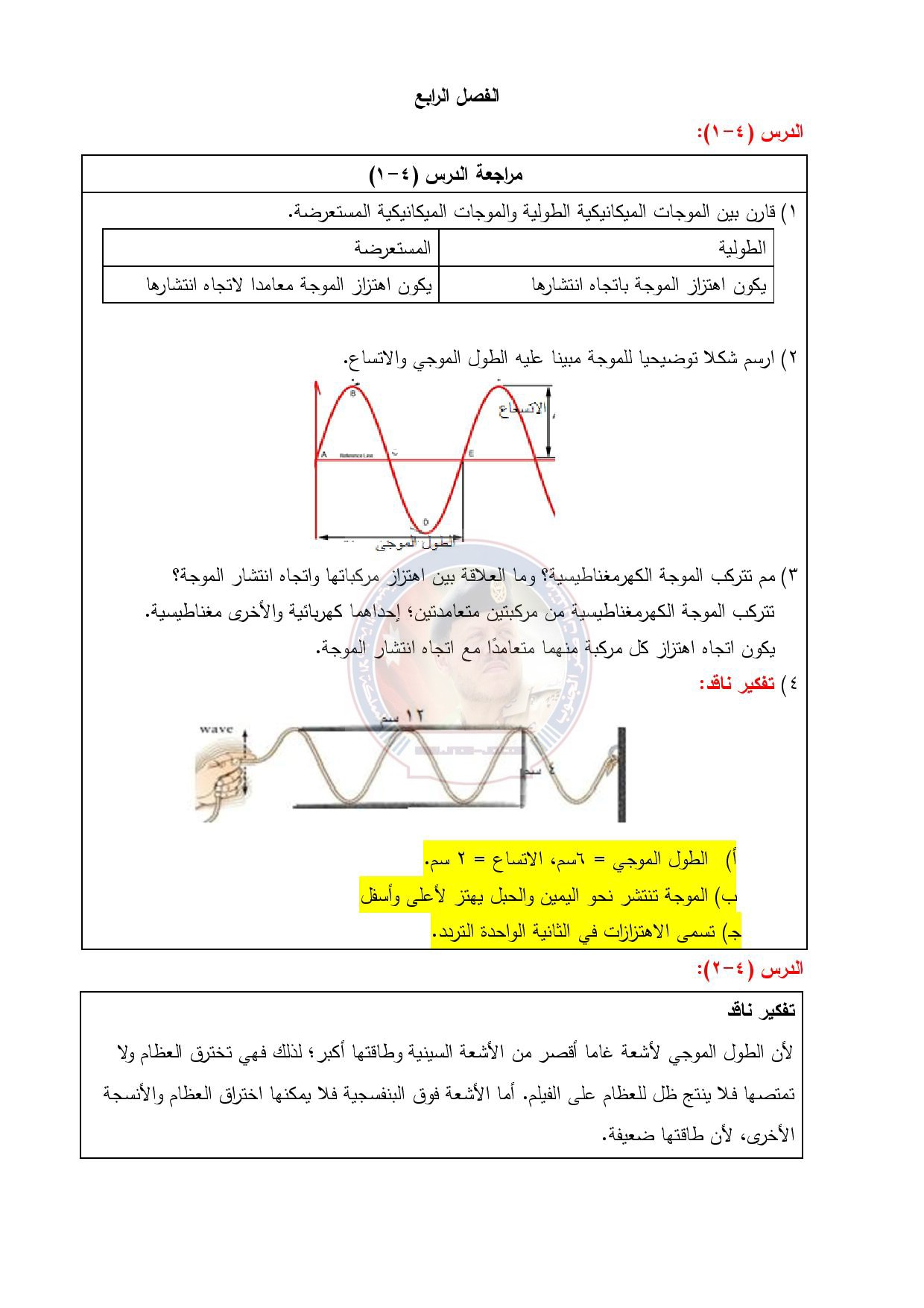 اجابات جميع دروس الفصل الرابع الطيف الكهرمغاطيسي الوحدة الثالثة التذبذبات والموجات لمادة الفزياء الص