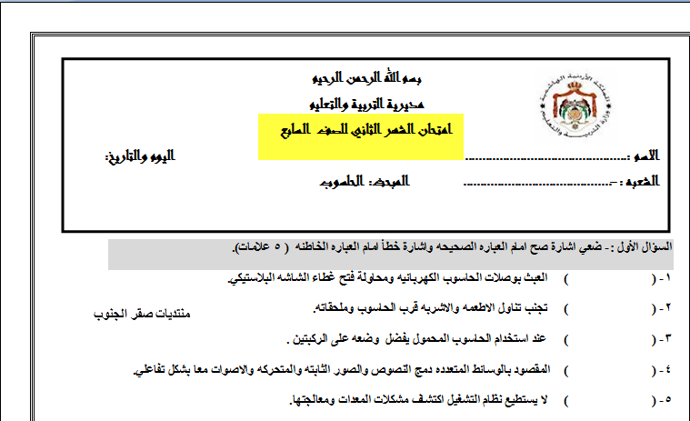 نموذج-1- Word قابل للتعديل اختبار الشهر الثاني لمبحث الحاسوب للصف السابع الفصل الأول