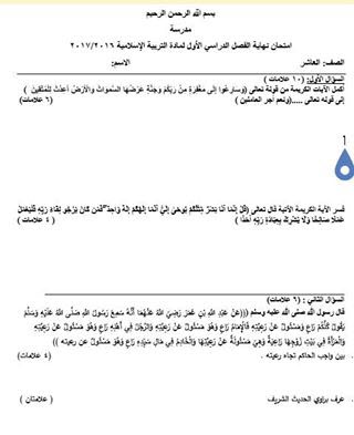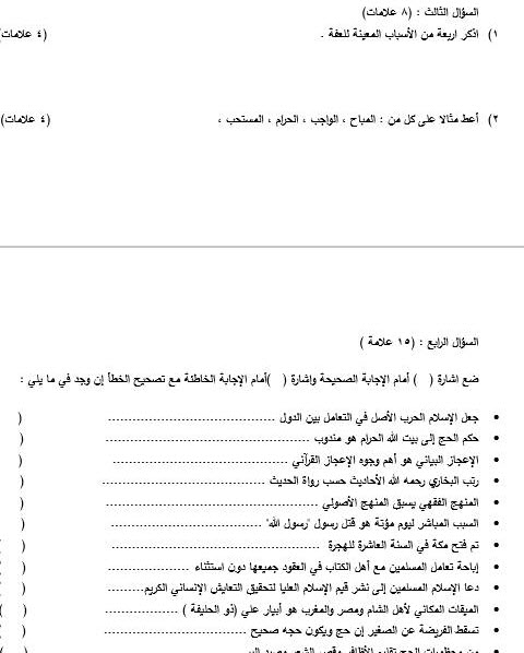 بالصور نموذج الامتحان النهائي لمادة التربية الاسلامية الصف العاشر الفصل الاول