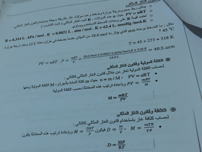 اوراق عمل وملخصات قوانين الغازات لمادة الكيمياء للصف الحادي عشر متقدم الفصل الثاني