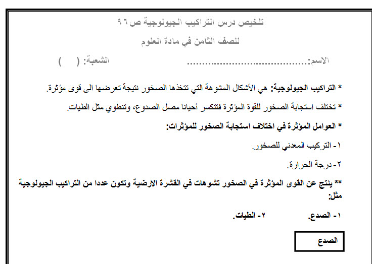 نموذج Word لخيص درس التراكيب الجيولوجية للصف الثامن في مادة العلوم الفصل الثاني 2017-2018