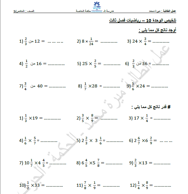 اكثر من 15 صفحة تلخيص شامل لمادة الرياضيات كاملة للصف الخامس الفصل الثالث
