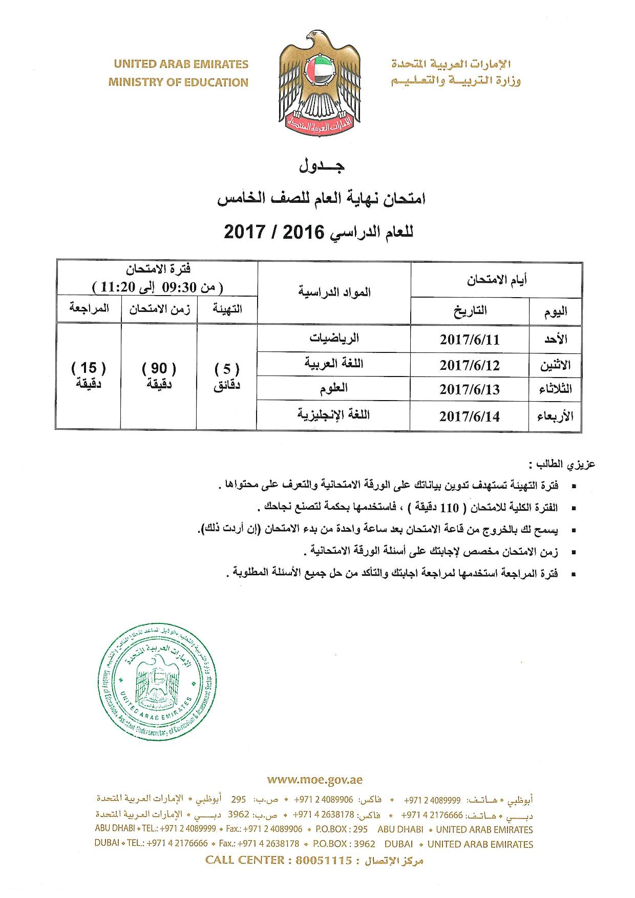 جدول امتحان نهاية العام الدراسي لجميع مواد الصف الخامس للفصل الثالث مصدق من قبل الوزارة