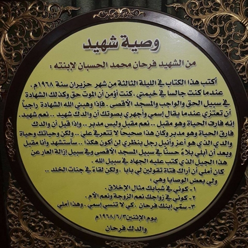 للشهيد الأردني الملازم فرحان محمد الحسبان (بني حسن)الذي سقط في ميدان الشرف في مواجهة القوات الإسرائيلية يوم الثالث من يونيو/ حزيران 1968 ووصيته لابنته الوحيدة ( فيحاء) وكان كتبها ليلة استشهاده.