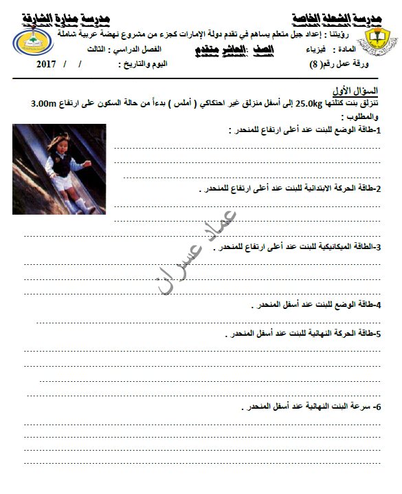 بالصور + ملف PDF أوراق عمل في مادة الفيزياء للصف العاشر الفصل الثالث