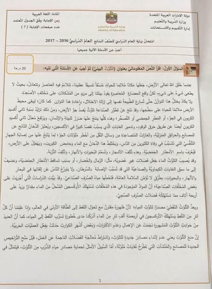 نموذج وزاري اعوام سابقة اختبار مادة اللغة العربية الصف السابع الفصل الثالث