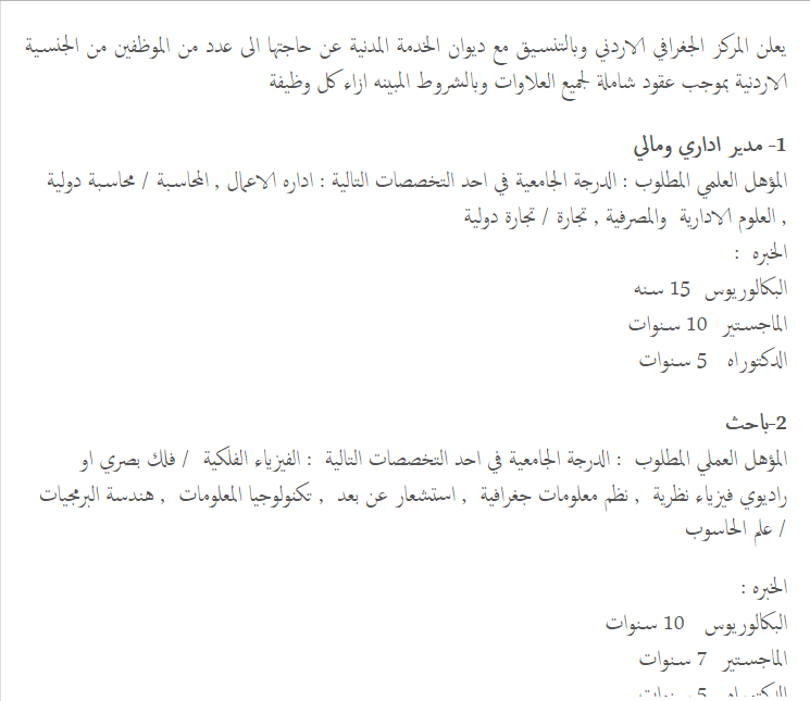 وظائف شاغرة :. يعلن المركز الجغرافي الملكي الاردني عن حاجته الى التخصصات التالية 16-07-2017
