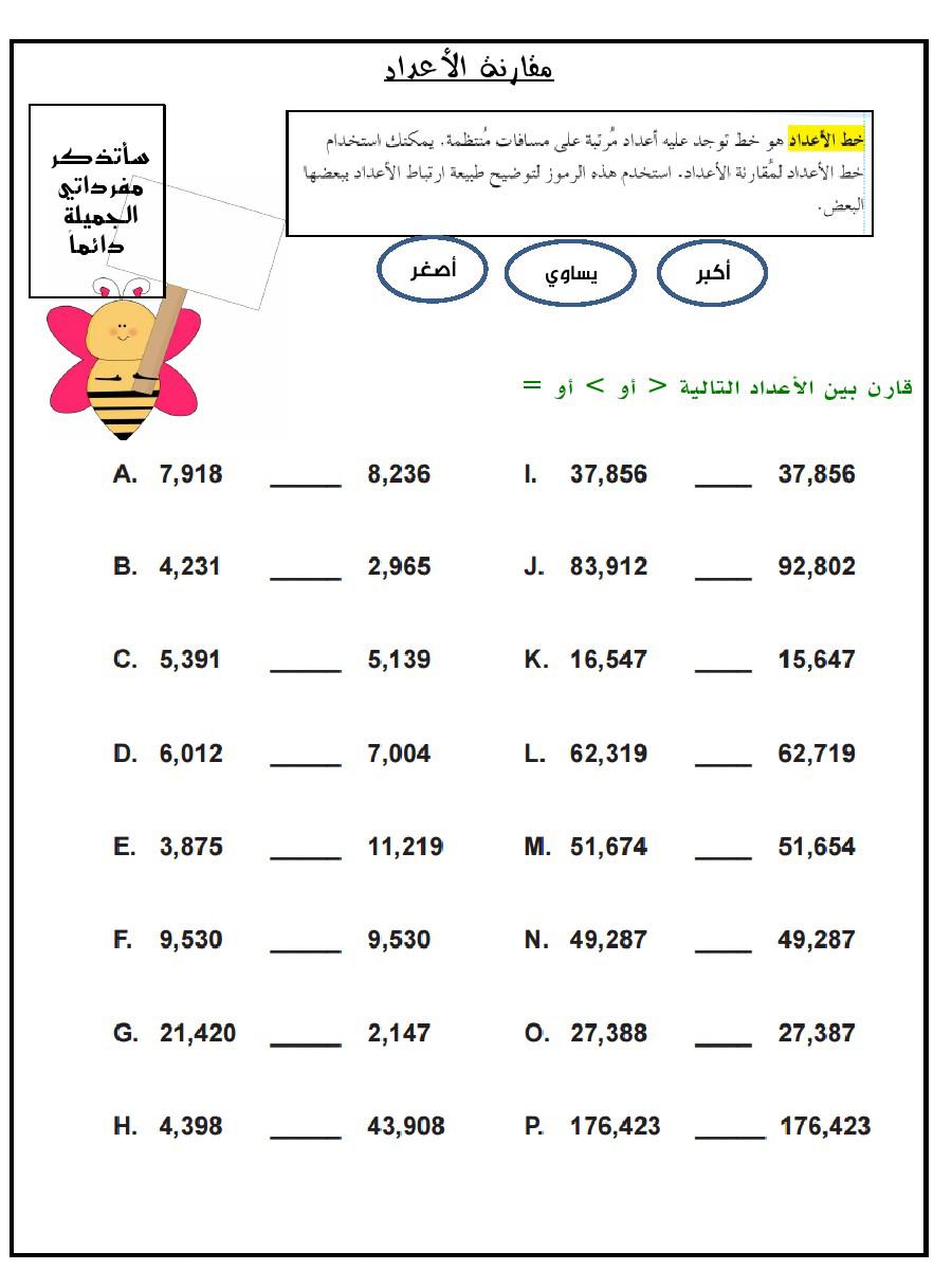 مراجعة في الرياضيات للصف الرابع مقارنة الاعداد الفصل الاول