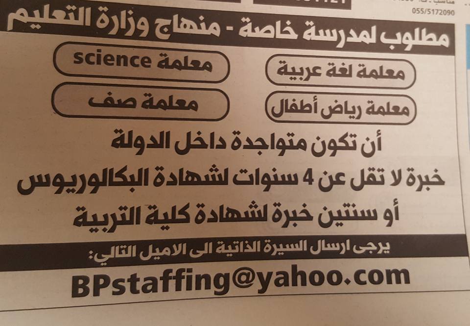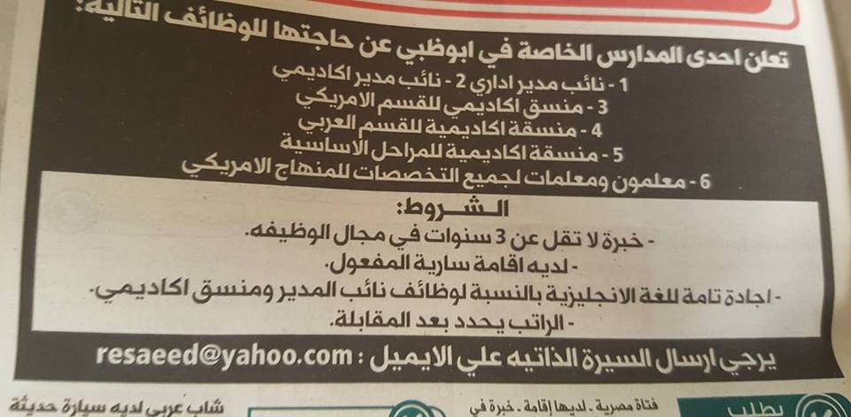 مطلوب مدرسين ومدرسات للعمل في دولة الامارات العربية المتحدة العام الدراسي 2017-2018
