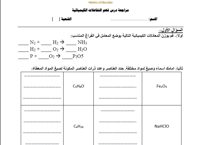 مراجعة درس فهم التفاعلات الكيميائية لمادة العلوم الصف الثامن الفصل الاول