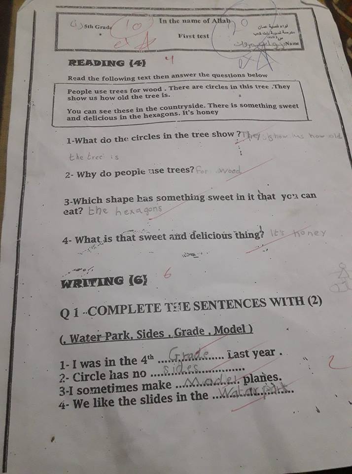 ننقل لكم:نماذج لامتحان الشهر الأول لمادة اللغة الإنجليزية للصف الخامس الفصل الأول