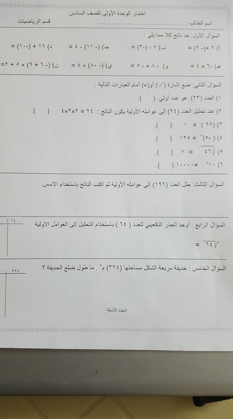 بالصور ننقل لكم :نموذج لامتحان الشهر الأول لمادة الرياضيات للصف السادس الفصل الأول
