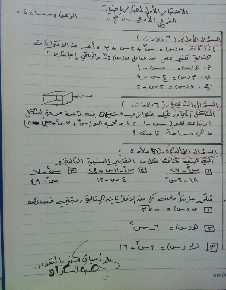 نموذج لامتحان الشهر الأول لمادة الرياضيات للصف الأول ثانوي -أدبي- الفصل الأول