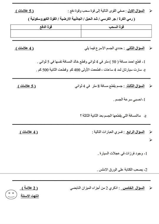 نموذح لامتحان الشهر الأول لمادة العلوم للصف الخامس الفصل الأول