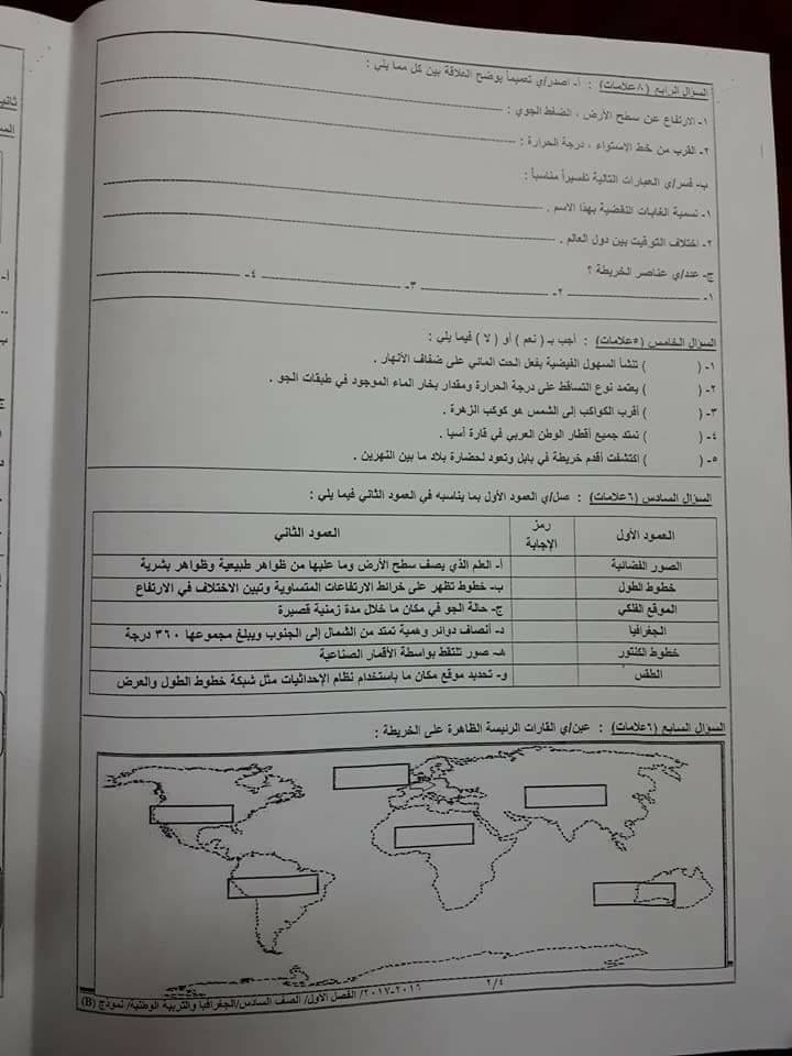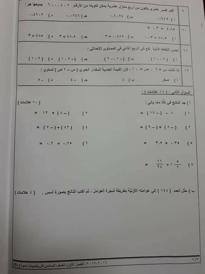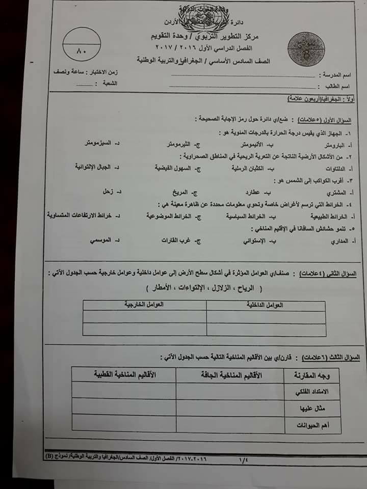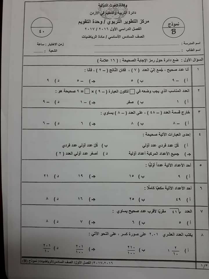 نماذج وكالة :الاختبارات النهائية للصف السادس الفصل الأول