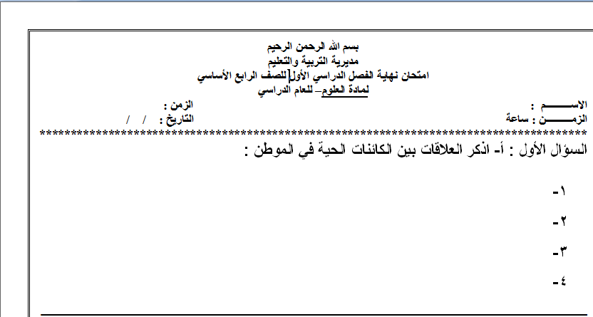 نموذج Word الإختبار النهائي لمادة العلوم الصف الرابع الفصل الأول 2017
