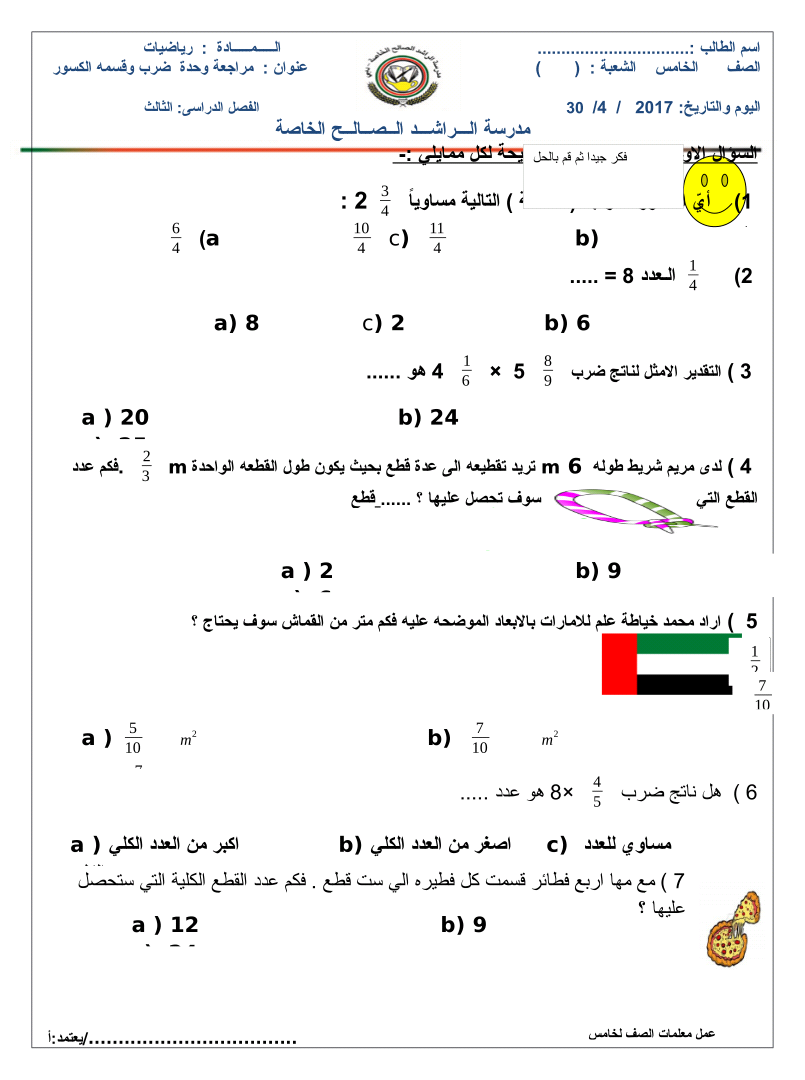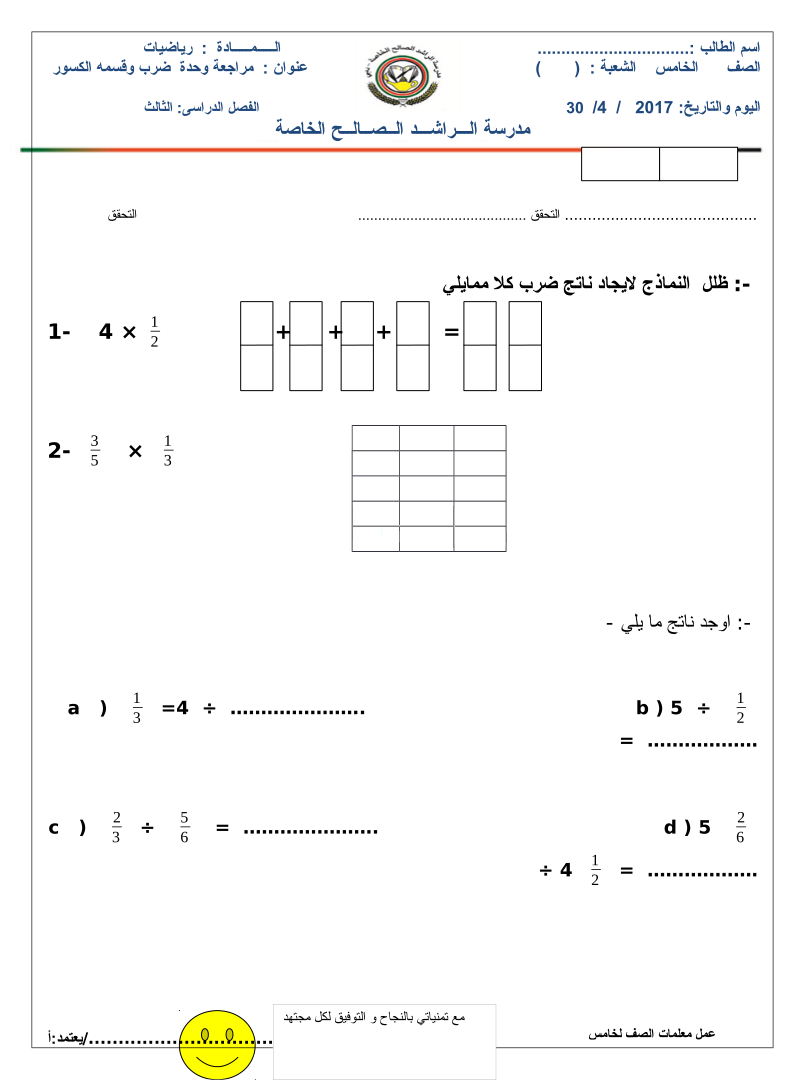 بالصور مراجعة وحدة ضرب وقسمة الكسور رياضيات للصف الخامس الفصل الدراسي الثاني
