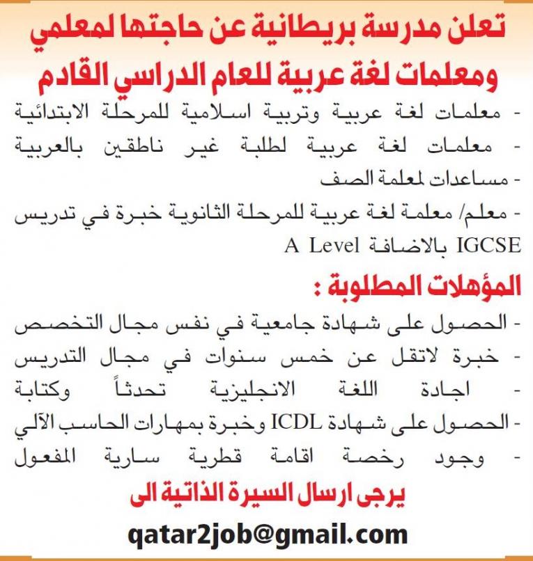 اعلان توظيف للعمل بمدرسة بريطانية كبرى فى قطر