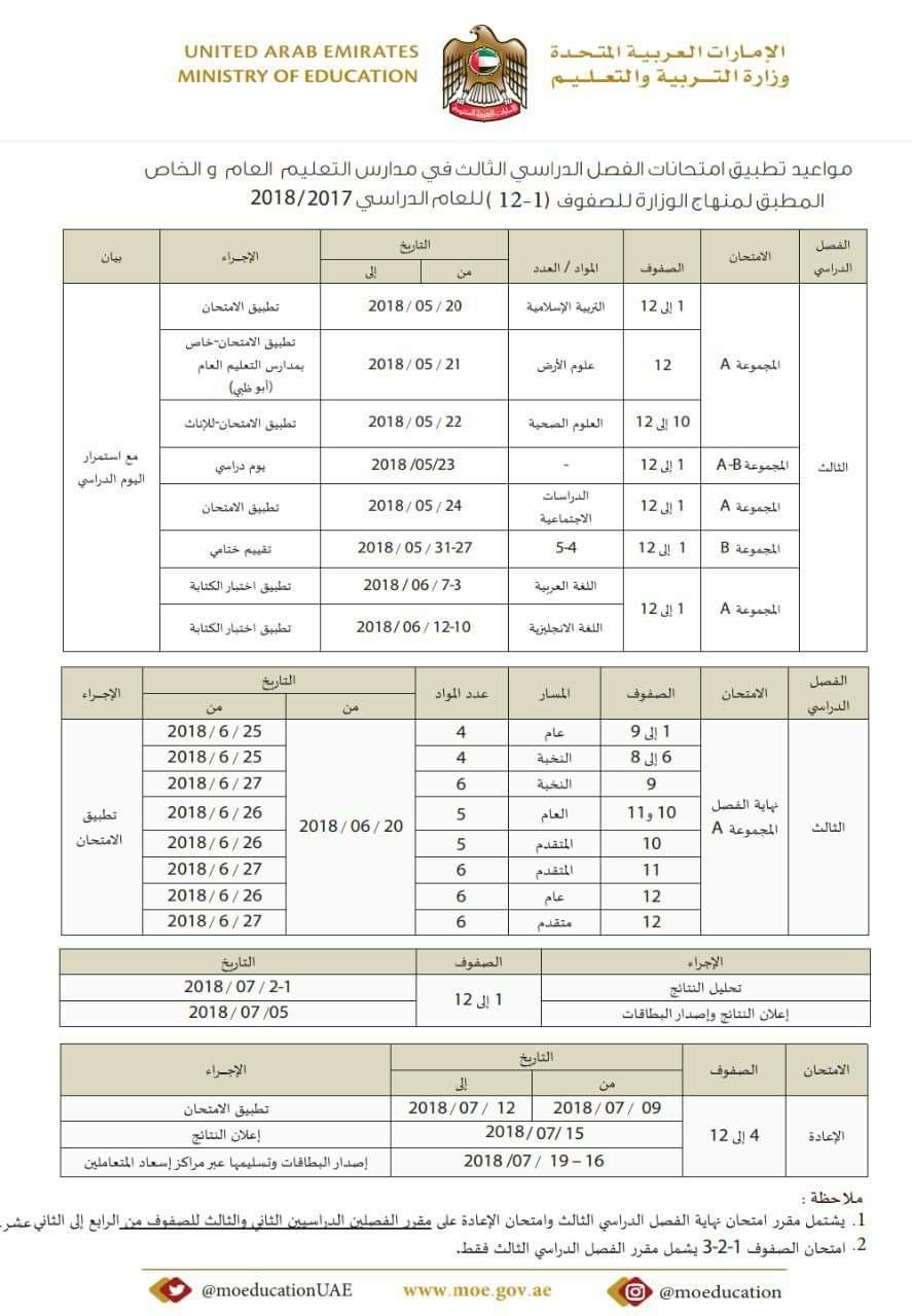 مواعيد تطبيق امتحانات الفصل الدراسي الثالث في مدارس التعليم العام والخاص المطبق لمنهاج الوزارة للصفوف (1-12) للعام الدراسي 2017-2018