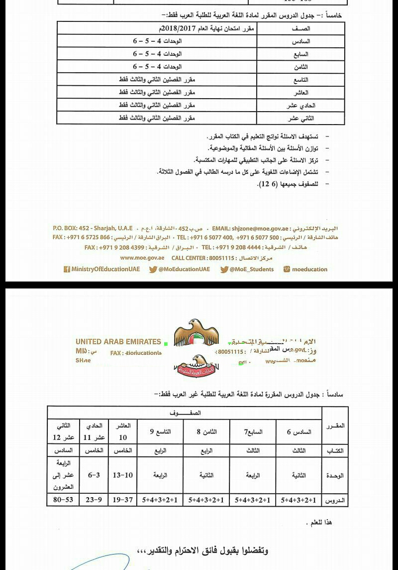 مقررات اللغة العربية امتحان نهاية العام الدراسي للصفوف من السادس وحتى الثاني عشر 2017-2018