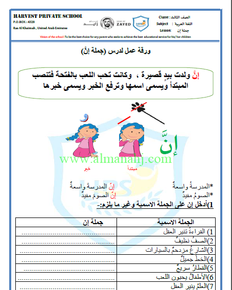 ورقة عمل جملة إن وأخواتها لمادة اللغة العربية الصف الثالث الفصل الثالث