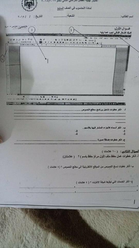 بالصور:نموذج الاختبار النهائي لمادة الحاسوب للصف السابع الفصل الثاني